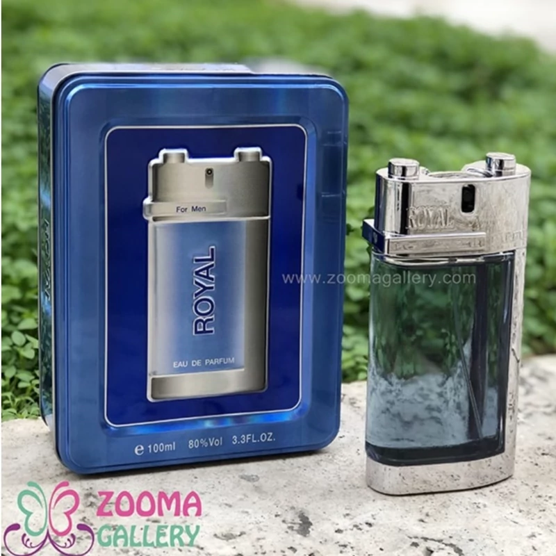 عطر ادکلن رویال فلزی آبی در یک جعبه فلزی بسته بندی شده است و بطری این عطر نیز بسیار زیبا و جذاب طراحی شده است، شیشه رنگی شفاف دارد و محتویات آبی رنگ داخل آن به خوبی قابل مشاهده است یک کلاف نقره ای رنگ استیل اطراف بطری را احاطه نموده است و درپوشی از همین جنس بر روی شیشه قرار دارد که بر زیبایی این محصول افزوده است.